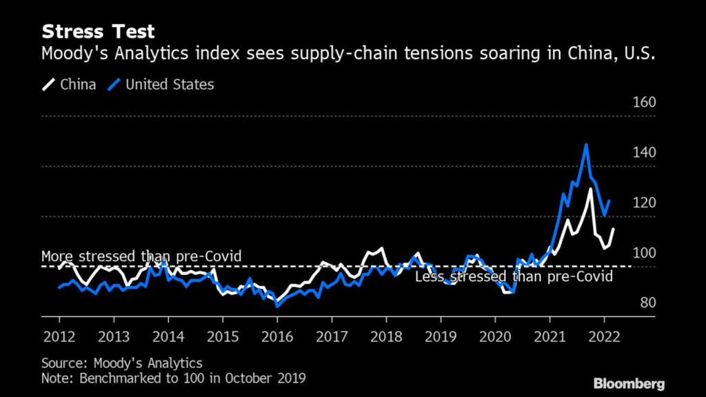 A Moody’s Analytics measure shows supply stress in the world’s two biggest economies, the U.S. and China, is still hovering well above the pre-pandemic norm.