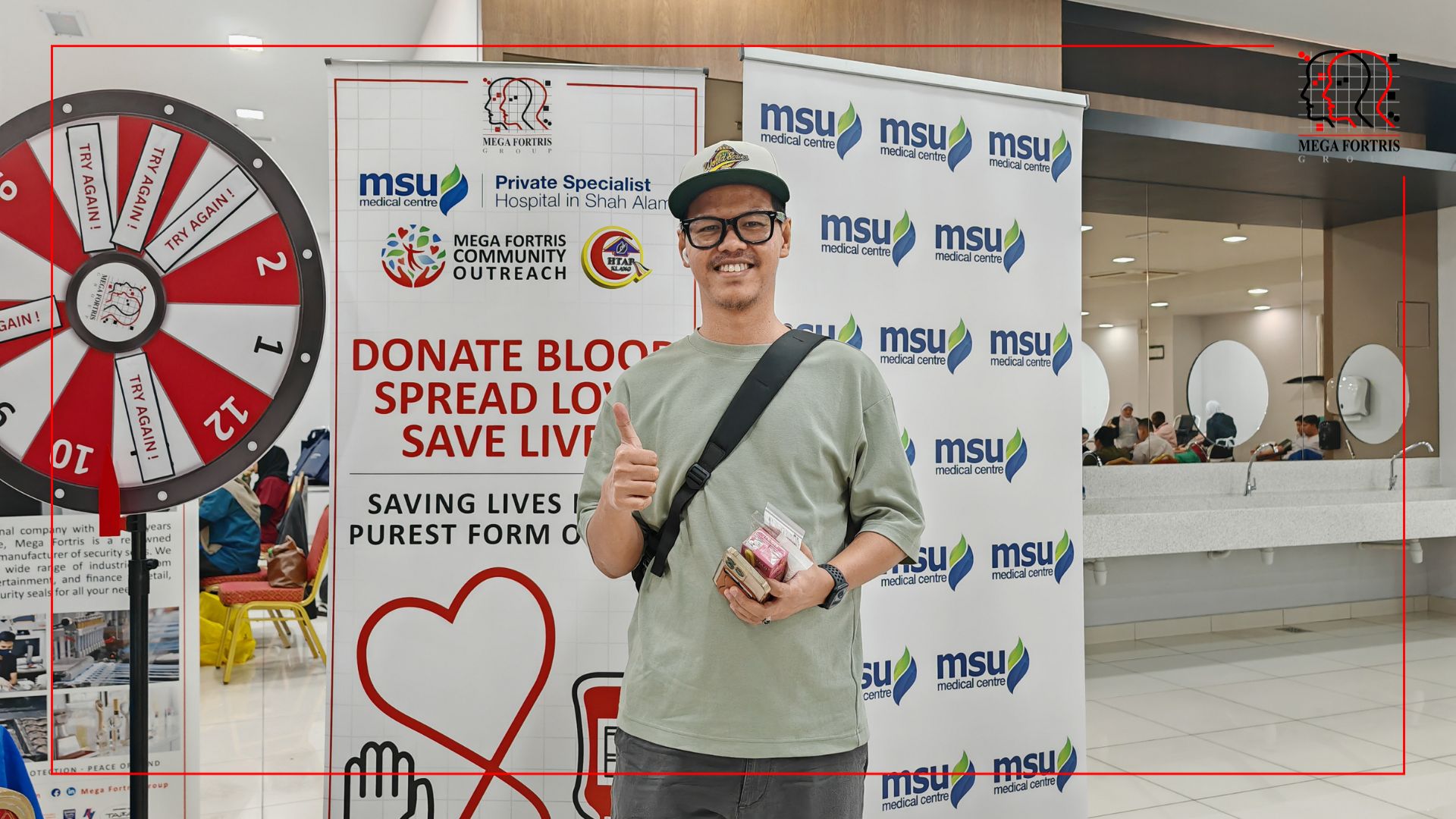 Les donneurs ont bénéficié d’examens de santé corporelle proposés par MSU MC, et ont pu faire tourner la roue au stand Mega Fortris pour tenter de gagner des lots attrayants. Parmi les heureux gagnants, deux donneurs sont repartis avec des bons d’achat de 100 RM, tandis que d’autres ont remporté des produits de toilette et des bons AEON d’une valeur de 50 RM et 20 RM.